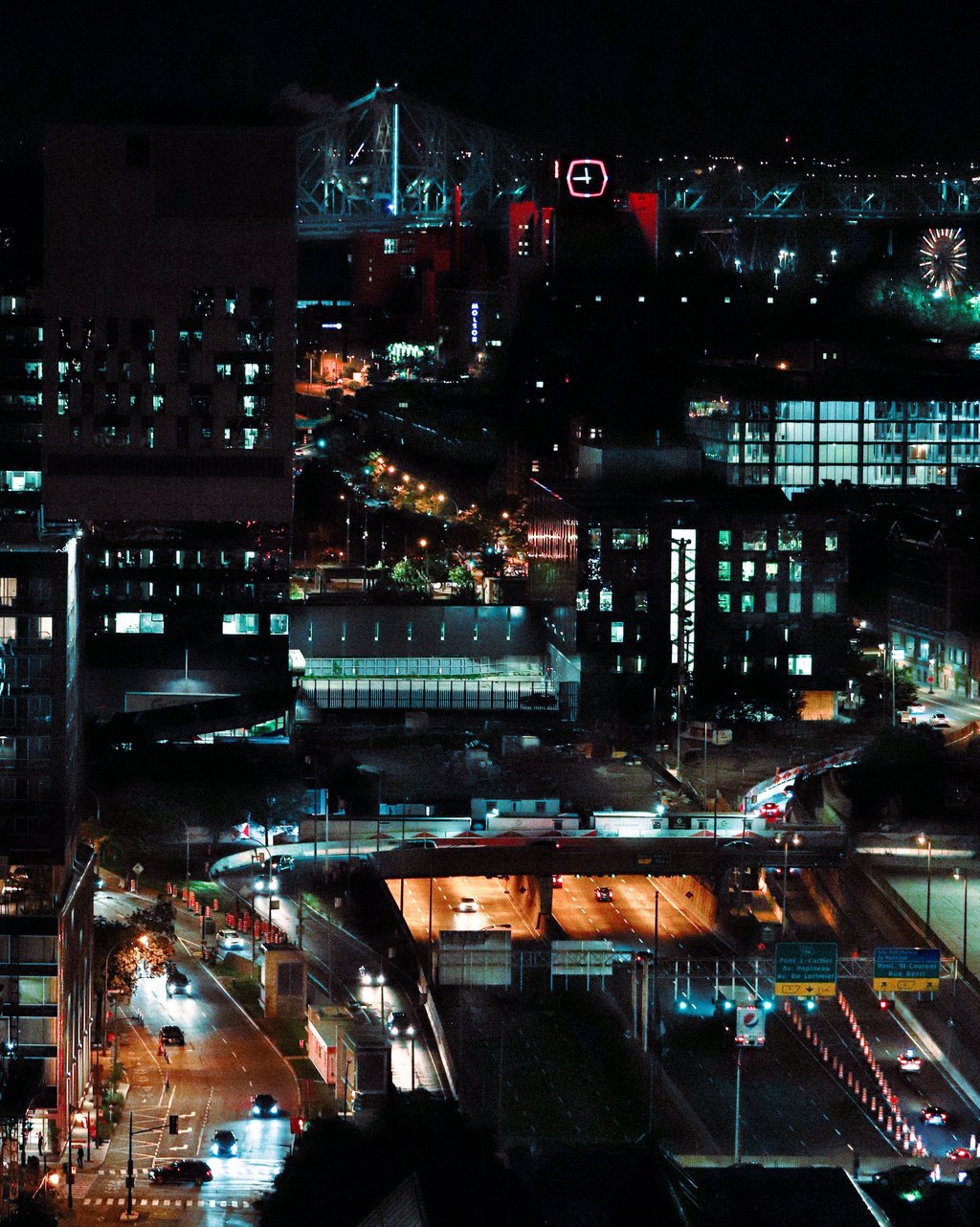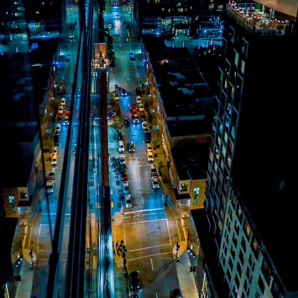 Shot from a high-rise, this image gives us a look at how the downtown streets looklike in the middle of the week at around midnight. Not too busy, not too calm.