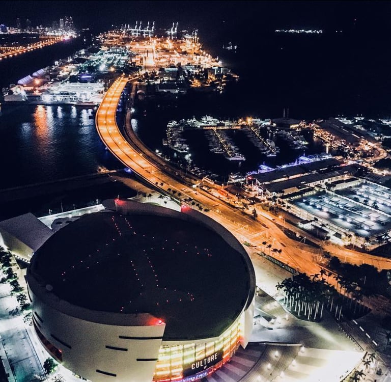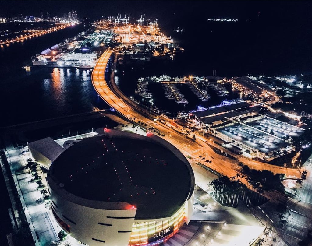 Back a few years ago, the Miami Heat Basketball arena was called the AA Arena (American Airlines Arena) and it had a very special airplane at the top. Today the arena goes by a different name. I shot this from the 50th floor in a nearby high-rise. (2017)
