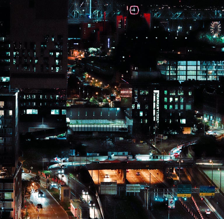This stunning Night photo was taken at the heart of Montreal Downtown facing the Champlain Bridge. I was situated in a high rise for this special opportunity.