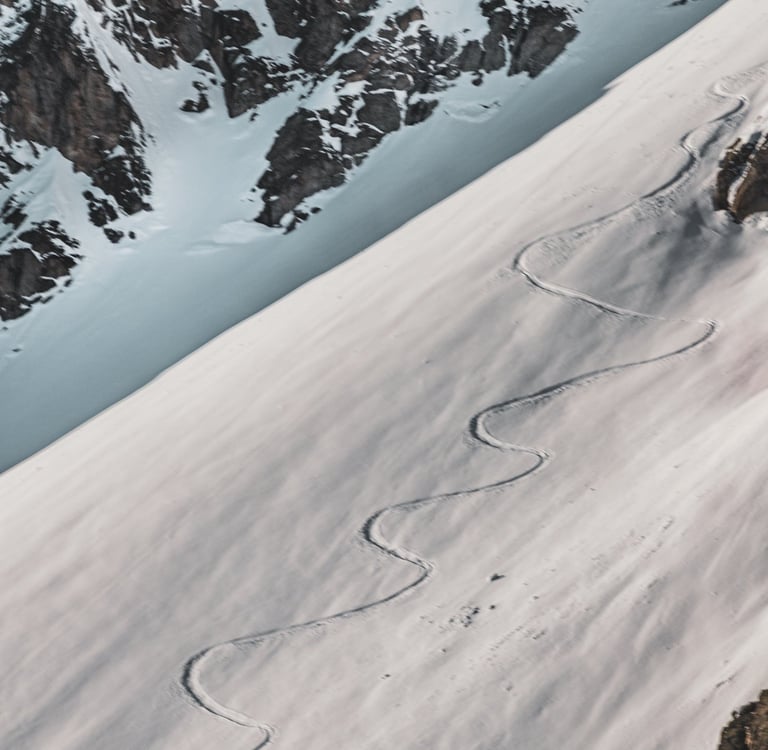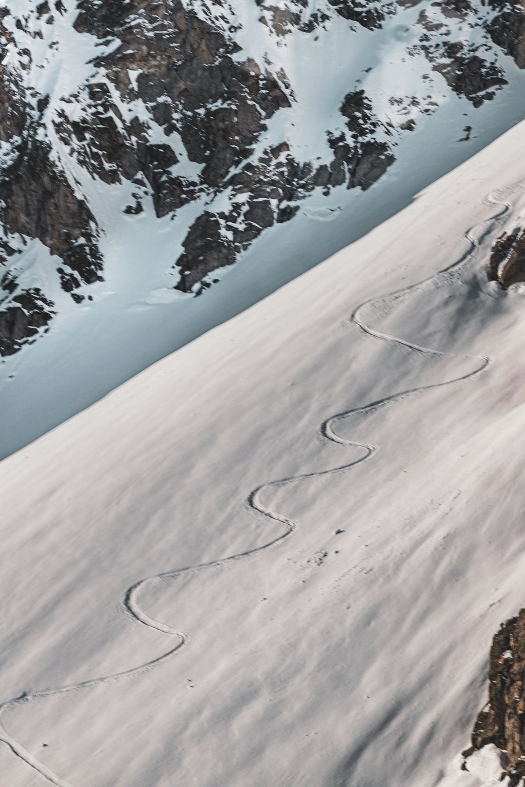 This image was taken at the summit of the Skyway Monte Bianco in 2019 on a beautiful sunny day. Here you see the tracks of a person that has just shredded the snow with skis. This must have been a tough descent. We see the rough terrain in the back and the smooth white snow in the foreground. Just a seamless playground for skiers.