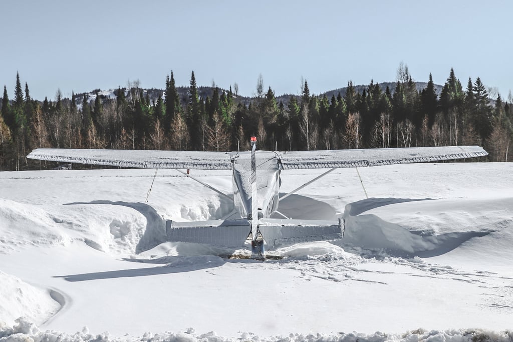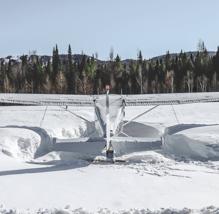 A small private airplane parked in the snow in st. Donnat, QC.